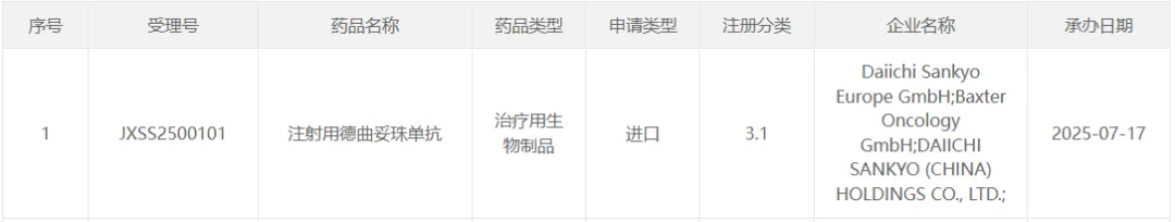7 月 17 日,第一三共和阿斯利康联合开发的 HER2 ADC 德曲妥珠单抗的新适应症申请获受理,单药用于HER2 阳性成人胃或胃食管结合部腺癌患者二线治疗。这是德曲妥珠单抗在国内的第 6 个适应症申请,已被纳入优先审评。