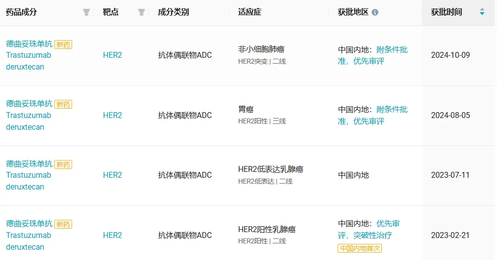 在国内,德曲妥珠单抗此前已经获批四项适应症(见下图),涵盖乳腺癌、胃癌、非小细胞肺癌。今年 6 月,德曲妥珠单抗用于 HER2 阳性成人胃或胃食管结合部腺癌二线治疗的上市申请也已被 CDE 纳入优先审评。