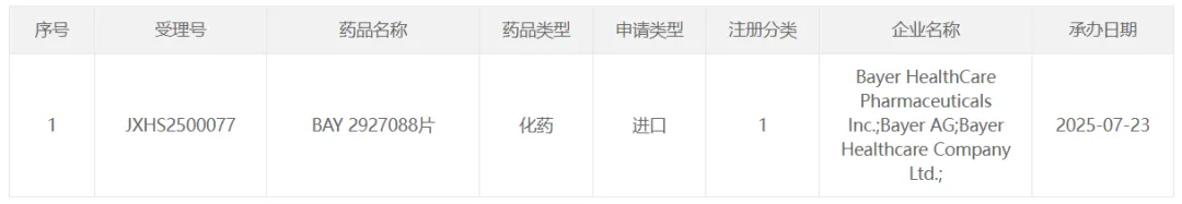 7 月 23 日,拜耳 1 类新药 BAY 2927088 片申报上市,适应症为用于治疗携带 HER2(ERBB2)激活突变且既往接受过一种全身性治疗的晚期非小细胞肺癌(NSCLC)成人患者。该申请已被纳入优先审评。