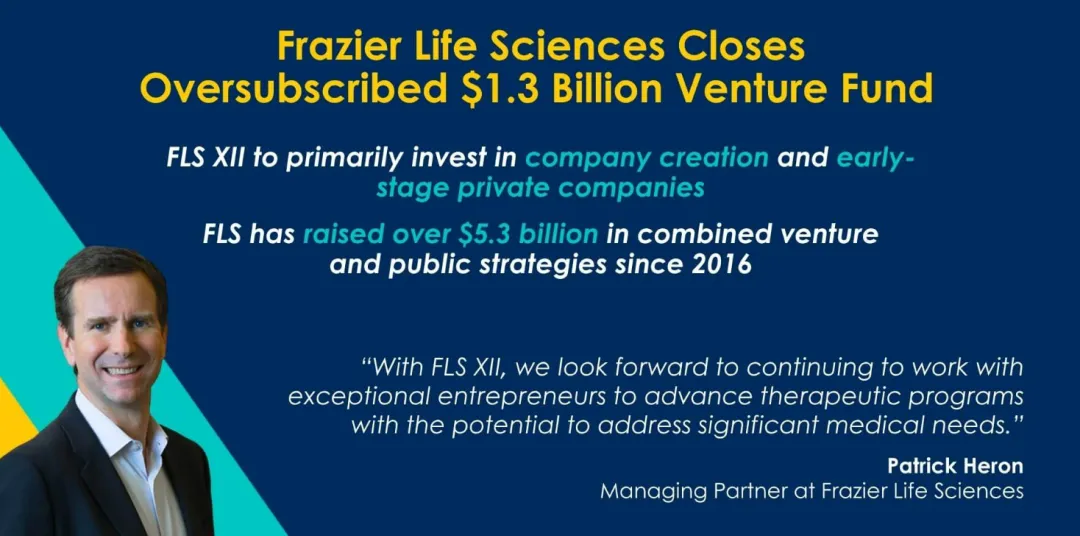 7月31日,加利福尼亚州帕洛阿尔托,专注于创新疗法的长期投资公司Frazier Life Sciences(FLS)宣布完成Frazier Life Sciences XII, L.P. (FLS XII)募资,规模超过13亿美元。超额认购的基金得到了长期和新有限合伙人的大力支持。与之前的FLS风险基金一致,FLS XII将主要投资于公司创建和早期私人生物制药公司。上周,澳大利亚生命科学风险投资公司Brandon capital完成了其迄今为止最大的基金,筹集了4.39亿澳元(约合2.9亿美元),而Omega Funds完成最新基金6.47亿美元募资。