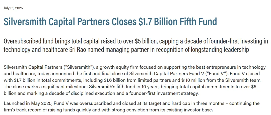 Partners宣布完成第五只基金17亿美元募资,继续投向科技和医疗健康。第五基金以17亿美元的总承诺额收盘,其中包括来自有限合伙人的16亿美元和来自Silversmith团队的1.1亿美元。此次收盘标志着一个重要的里程碑:Silversmith