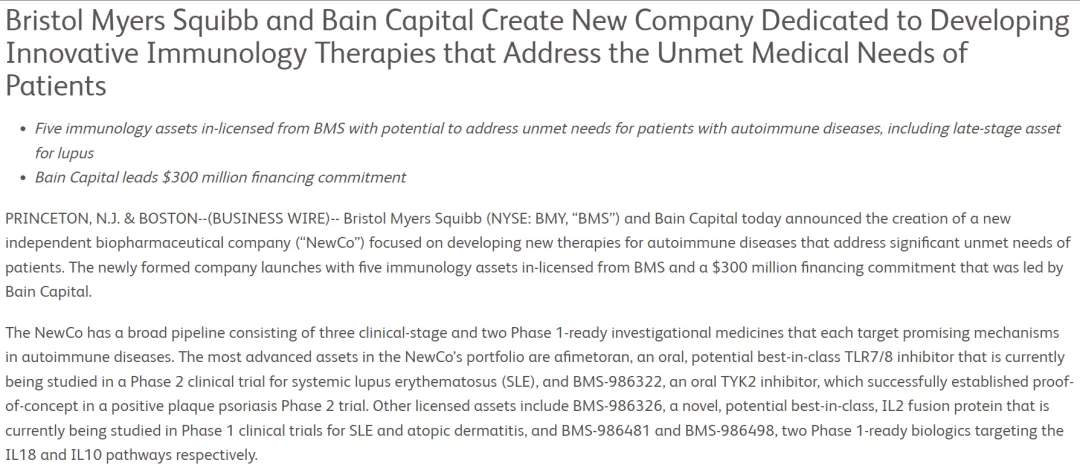 BMS拆分5款自免新药,包括TLR7/8抑制剂Afimetoran、TYK2抑制剂BMS-986322、IL-2融合蛋白BMS-986326、IL-8靶向BMS-986481、IL-10靶向BMS-986498,由贝恩资本领投的3亿美元融资。BMS在NewCo层面持股接近20%,并有权获得与每项资产成功相关的特许权使用费和里程碑。