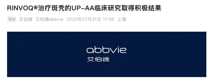 7 月 31 日,艾伯维宣布,乌帕替尼(upadacitinib,商品名:Rinvoq)治疗斑秃的 UP-AA 临床研究中两项关键性研究中的第一项取得积极结果。该研究评估了乌帕替尼在成人和青少年重度斑秃(AA)患者中的安全性与有效性。受试者的基线平均 SALT 评分为 83.8(约等于 16% 的头皮毛发覆盖率)。