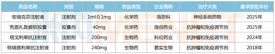 4款拟进院新药均为独家1类创新药,包括2款化学药和2款生物药;从剂型上看,注射剂和胶囊剂分别占3个和1个席位;按治疗大类统计,抗肿瘤和免疫调节剂以3个产品在数量上领跑,神经系统药物则有1个产品在列。