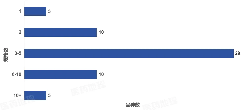 从规格维度上看,42个品种呈现高度集中,规格数均≥3;仅13 个品种规格≤2,占比不足24%。口服制剂中,地氯雷他定与阿莫西林克拉维酸均以7个规格并列首位;注射剂则以碳酸氢钠注射液规格最为丰富,达13个,充分反映临床多样化需求及企业差异化布局。