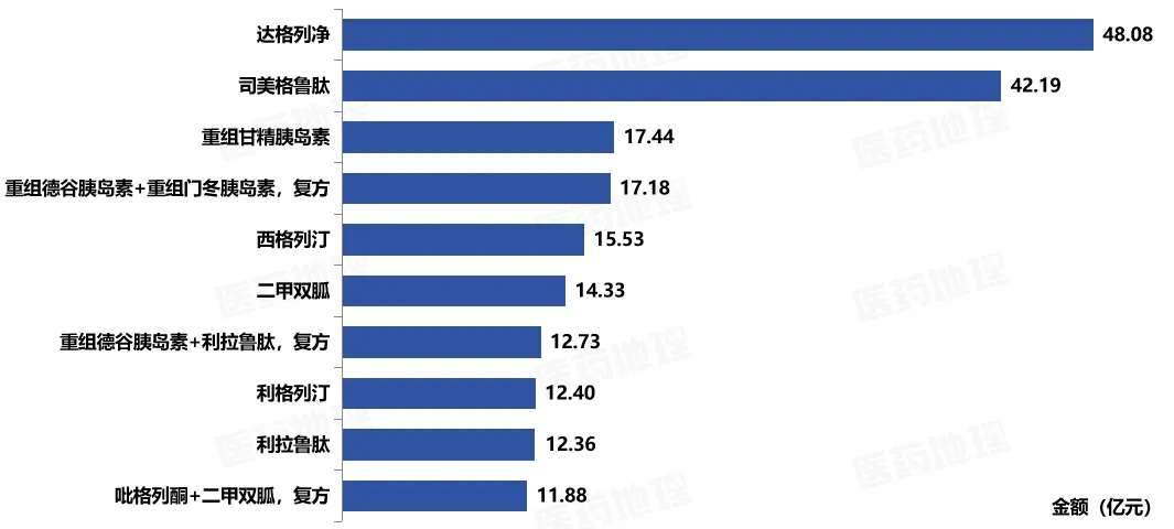 图6 2024年国内院端放大2型糖尿病药物市场销售额 TOP10