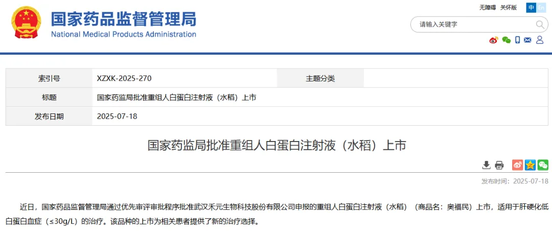 7月18日,国家药监局(NMPA)官网显示,禾元生物的重组人白蛋白注射液(水稻)(商品名:奥福民)获批上市,用于治疗肝硬化低白蛋白血症(≤30g/L)。该药物是我国首个获批上市的重组人血清白蛋白产品。