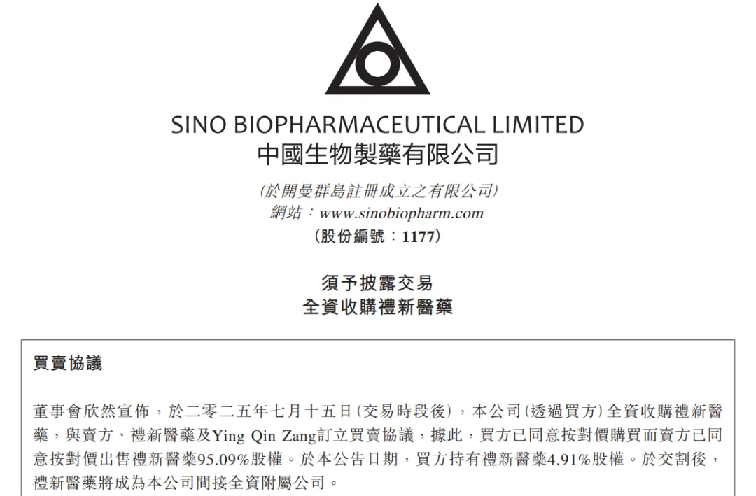 2025年7月15日,中国生物制药公告显示,将以最高9.509亿美元总对价收购上海礼新医药95.09%股权,叠加先前C轮融资已持有的4.91%股权,礼新医药将成为其间接全资附属公司。剔除礼新账面4.5亿美元现金后,实际交易现金支出约5亿美元。
