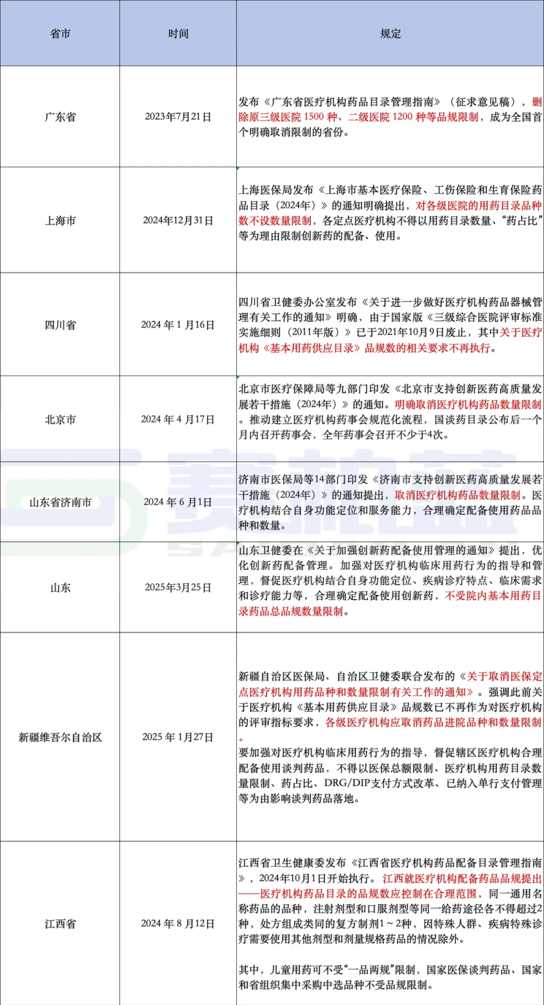 从具体的规定来看,上海、北京、四川、山东济南、新疆在相关文件中均明确了取消医疗机构用药数量限制/对各级医院的用药目录品种数不设数量限制;山东卫健委在《关于加强创新药配备使用管理的通知》中则提出,合理确定配备使用创新药,不受院内基本用药目录药品总品规数量限制。