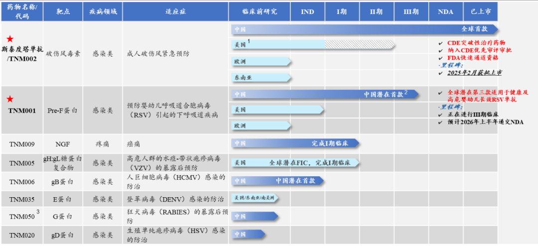 重组抗呼吸道合胞病毒(RSV)全人源单克隆抗体TNM001:是潜在的全球第三、中国首款适用于健康及高危婴幼儿的预防用长效抗RSV单抗药物,公司的另外一款核心产品,其目前正在进行临床III期试验,预计2026年上半年申报上市。
