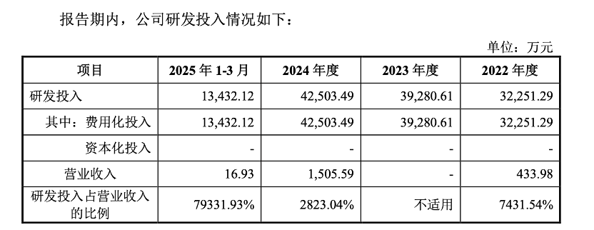 3.23亿元、3.93亿元、4.25亿元及1.34亿元,2022年至2024年复合年均增长率为14.80%。其中,2025年前三个月公司研发投入占营业收入的比例比例高达79331.93%(因收入基数极低)。