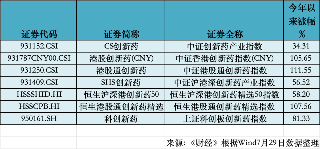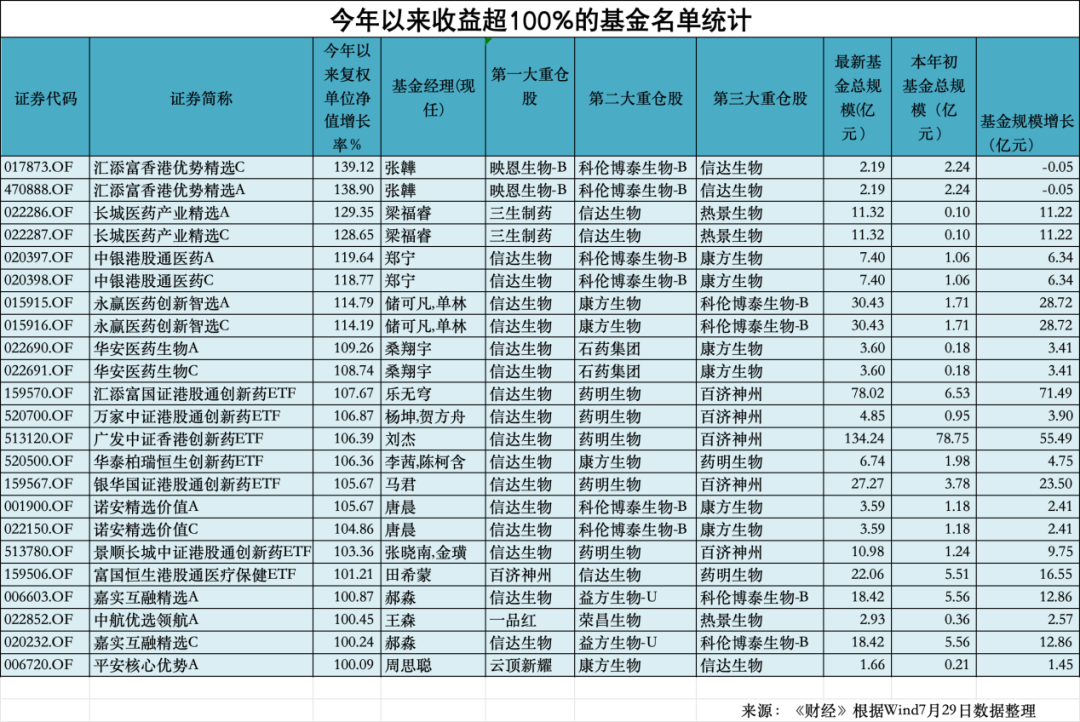 Wind(万得)数据显示,截至7月29日,今年以来已有16只基金收益超100%,清一色重仓创新药领域。