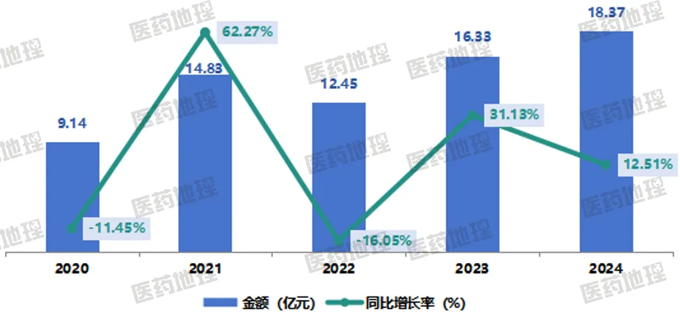 康柏西普眼用注射液是康弘药业自主研发的具有完全自主知识产权的1类生物创新药,该产品采用中国仓鼠卵巢细胞(CHO)生产,在人源化抗VEGF融合蛋白眼用注射液领域取得突破,能有效与血管及组织中的VEGF结合,阻断由VEGF介导的促进新生血管出芽和生长的信号传递。康柏西普眼用注射液于2013年获批用于治疗湿性年龄相关性黄斑变性(nAMD),2017年获批用于治疗继发于病理性近视脉络膜新生血管引起的视力损伤(pmCNV),2019年获批用于治疗糖尿病性黄斑水肿(DME)引起的视力损害,2022年获批用于治疗继发于视网膜静脉阻塞(RVO)(视网膜分支静脉阻塞(BRVO)或视网膜中央静脉阻塞(CRVO))的黄斑水肿引起的视力损伤。PDB药物综合数据库显示,康柏西普眼用注射液国内院端放大市场金额从2020年9.14亿元波动上升2024年的18.37亿元,市场逐渐步入成熟期。
