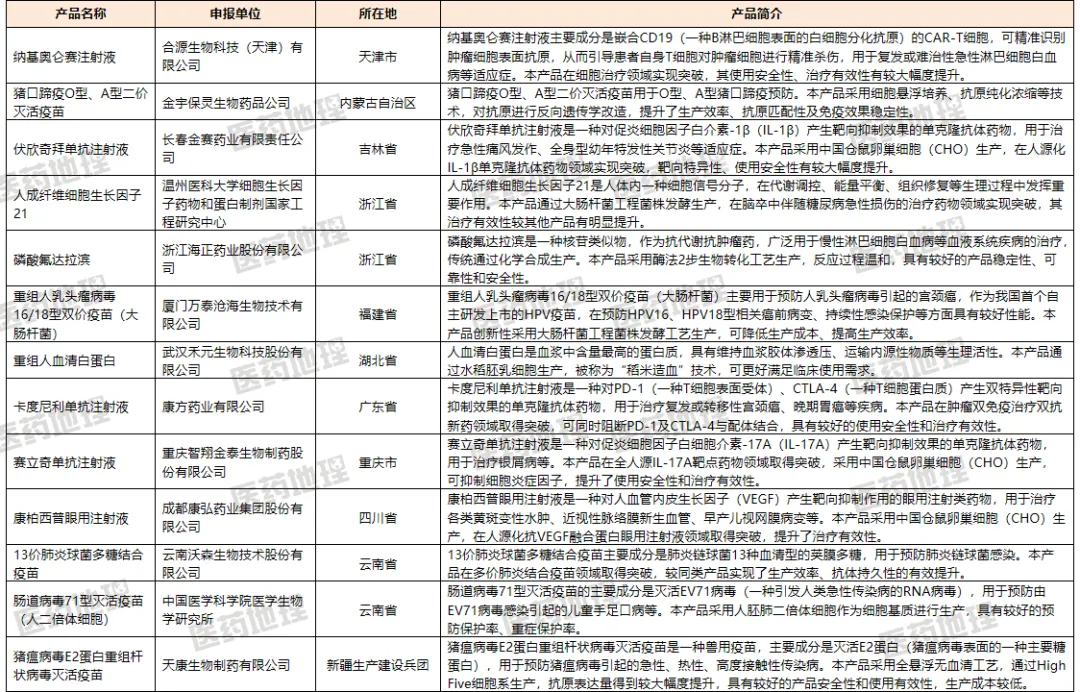表1:13个生物制药领域产品简介 来源:生物制造标志性产品名单(第一批)