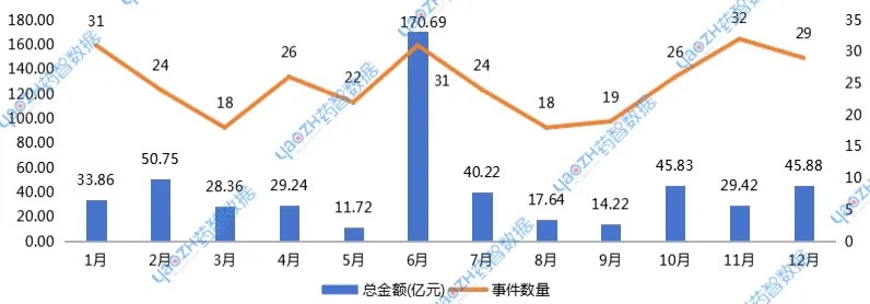 药智数据显示,2024年中国药品行业投融资事件共发生300起,金额约517.81亿元。2024年中国药品行业的月度趋势来看,1、6、11月为融资高峰期,融资事件数分别达31、31、32起,6月融资总额最高,达170.69亿元,为全年投资融总额最多的月份;8月和9月为融资低谷期,融资事件数、融资金额均处于较低水平。