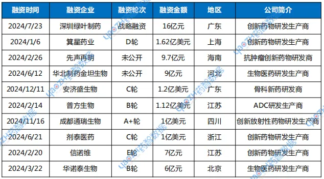 创新药研发企业深圳绿叶制药和箕星药业融资额均超过10亿元人民币。