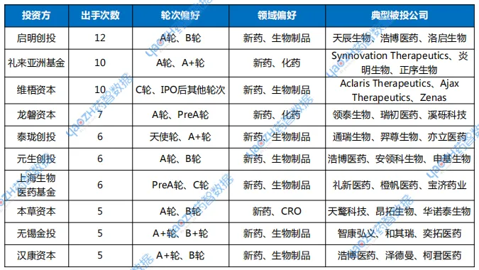 相较去年,2024年中国药品行业投资机构活跃TOP10的投资机构中,投资热度最高的轮次仍为A轮,投资B轮热度略有增加,投资热度最高的领域为新药和生物制品。