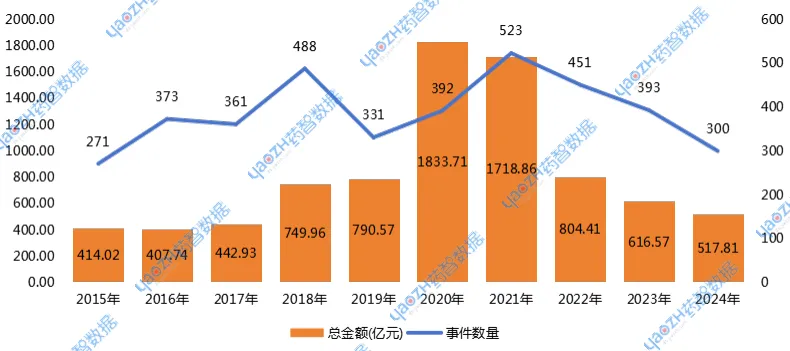 图3 中国2015-2024年国内药品行业投融资变化趋势