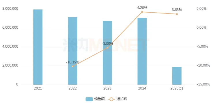 米内网数据显示,在中国城市公立医院、县级公立医院、城市社区中心以及乡镇卫生院(简称中国公立医疗机构)终端,抗肿瘤化药2021年销售额达历史新高的近800亿元,随后2022-2023年均有不同程度的下滑,2024年重现上涨达700亿元以上,2025Q1继续以3.63%的增速增长至超180亿元。