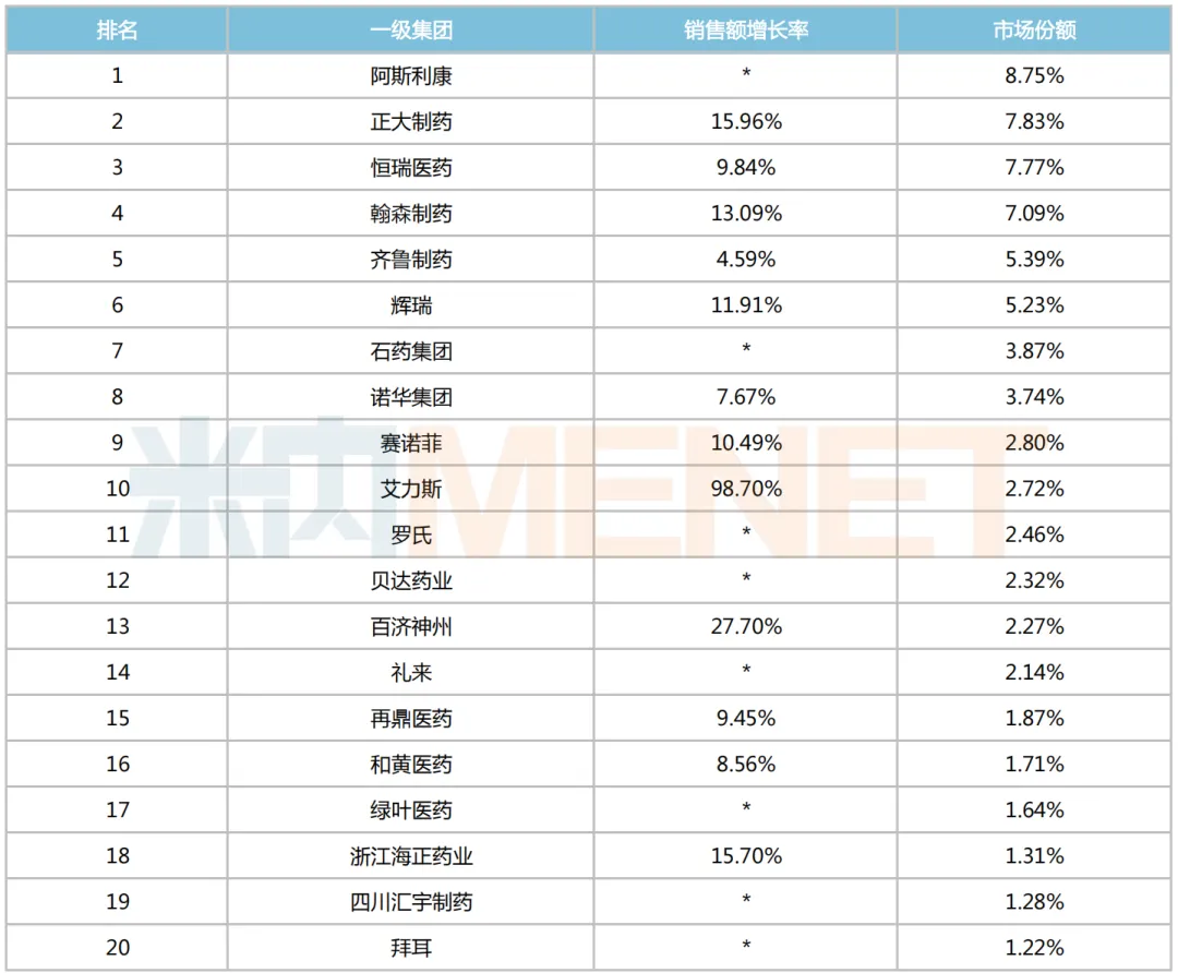 一级集团销售额TOP20方面,阿斯利康、正大制药、恒瑞医药依次排名前三,销售额均在14亿元以上,合计市场份额超24%;从销售额增速上看,翰森制药、正大制药、百济神州、海正药业、艾力斯、辉瑞、赛诺菲等涨幅均达两位数。