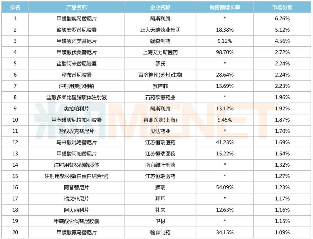 12个品牌销售额实现正增长,其中艾力斯的甲磺酸伏美替尼片暴涨98.7%、辉瑞的阿昔替尼片大涨54.09%、恒瑞医药的马来酸吡咯替尼片大涨41.23%、翰森制药的甲磺酸氟马替尼片增长34.15%、百济神州的泽布替尼胶囊增长28.64%,正大天晴药业的盐酸安罗替尼胶囊、恒瑞医药的甲磺酸阿帕替尼片等5个品牌均涨逾12%。