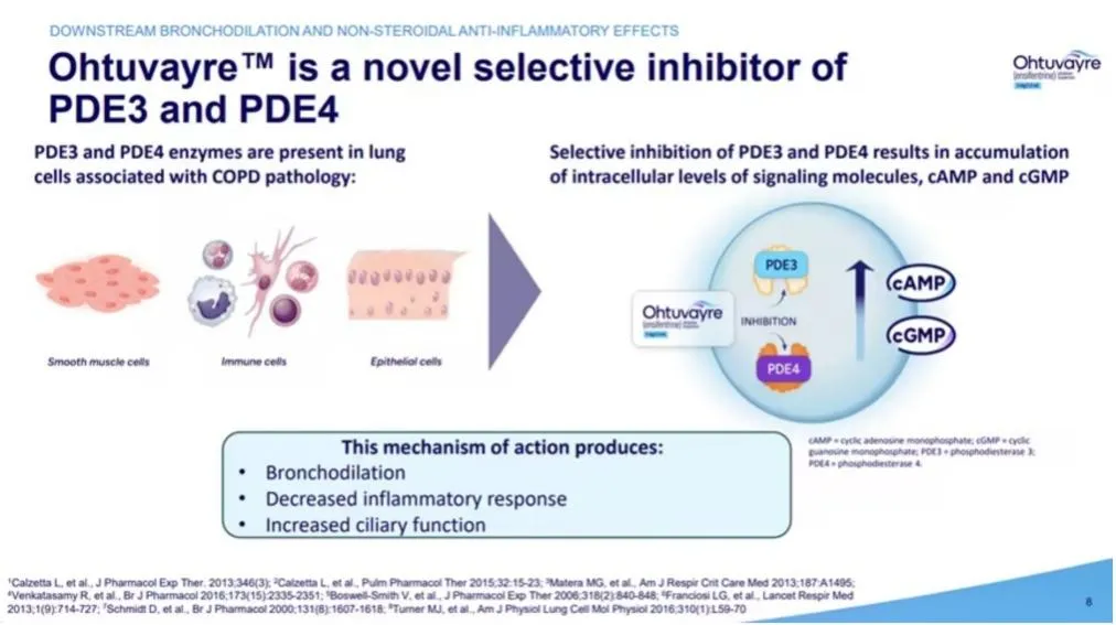去年6月,FDA批准Verona Pharma公司的Ensifentrine上市,成为全球首个PDE3/4双靶点抑制剂。这款药物的创新性在于通过双重抑制PDE3与PDE4,同步实现支气管扩张与抗炎作用,通过雾化吸入直达肺部,最大化药物局部暴露量,显著减少了口服PDE抑制剂常见的全身性副作用(如腹泻、恶心)。