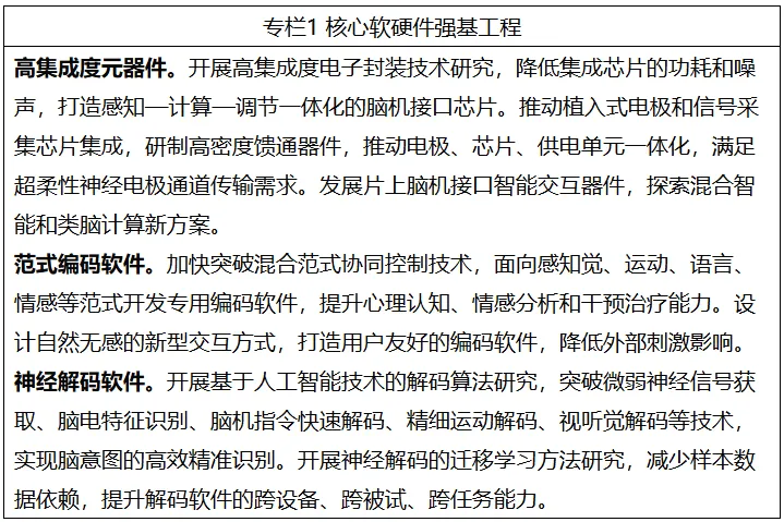 (三)夯实软件工具底座。完善脑信号编解码软件,降低编码过程的认知负荷,应用人工智能技术强化解码能力和任务迭代优化能力,提升编解码准确率、响应速率和场景通用性。开发专用控制交互软件,提升设备控制和神经调控的精准度,增强多任务协同处理能力。构建专用操作系统和通用软件平台,实现多模态数据集成、编解码算法兼容和交互软件可编辑功能,优化用户使用体验。