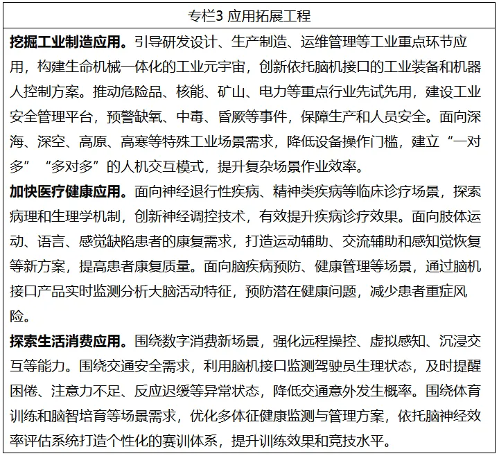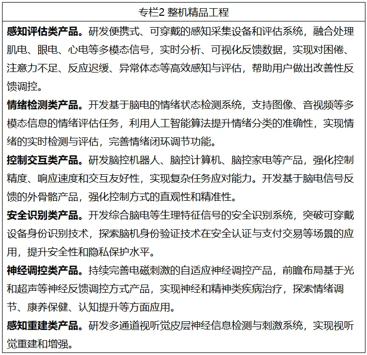 到2027年,脑机接口关键技术取得突破,初步建立先进的技术体系、产业体系和标准体系。电极、芯片和整机产品性能达到国际先进水平,脑机接口产品在工业制造、医疗健康、生活消费等加快应用。产业规模不断壮大,打造2至3个产业发展集聚区,开拓一批新场景、新模式、新业态。