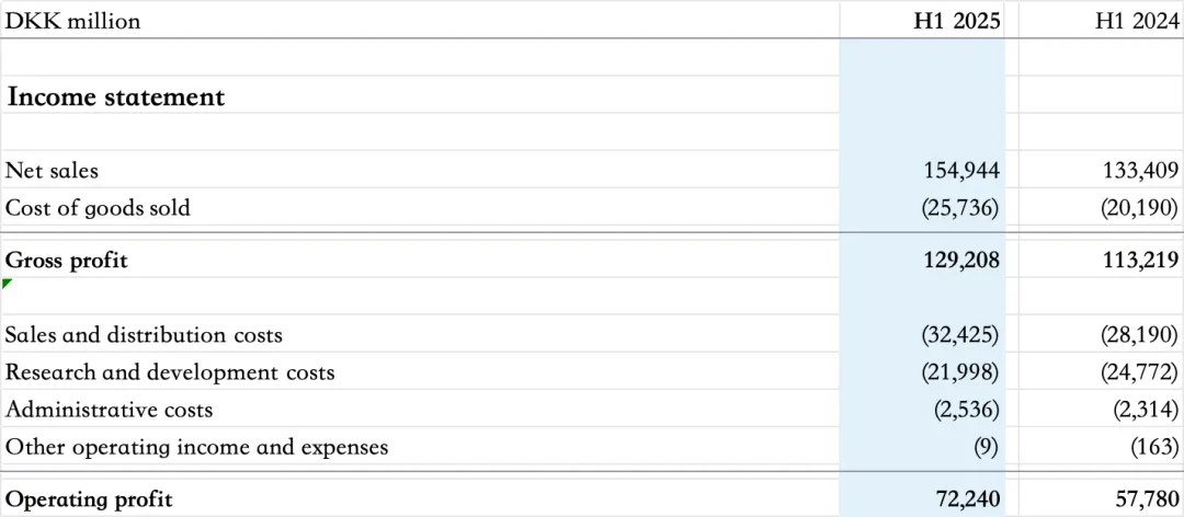 8 月 6 日,诺和诺德发布 2025 年 H1 财报,上半年营收 1549.44 亿丹麦克朗(约合 228.54 亿美元,按平均汇率计算:1 丹麦克朗 = 0.1475 美元,下同),同比增长 18%(按 CER 计算)。中国区收入 99.10 亿丹麦克朗(14.62 亿美元),同比增长 6%。研发投入 219.98 亿丹麦克朗,约合 32.45 亿美元。