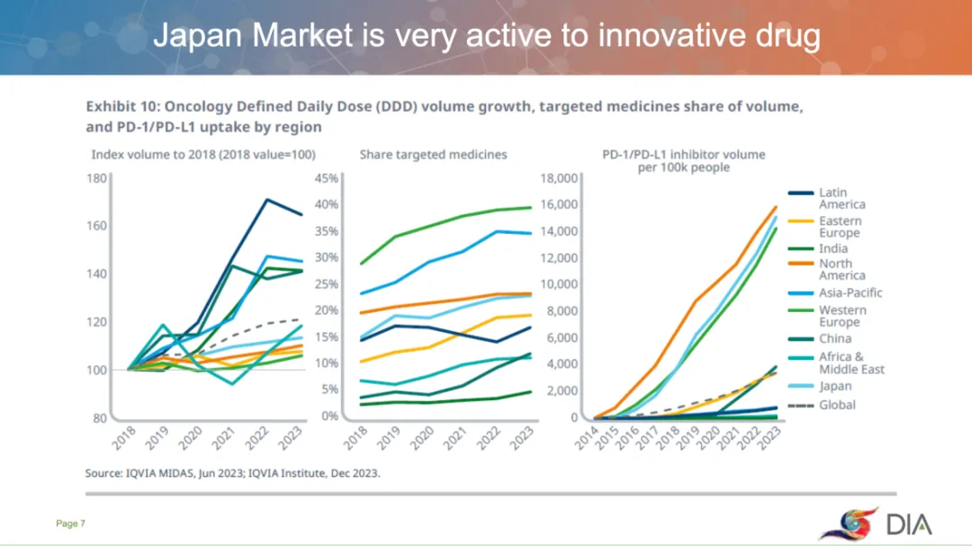为了展现日本医药市场的吸引力,宇山佳明的PPT从多个角度展示了日本创新药的活跃度(见下图),包括肿瘤按每日定义剂量(Oncology Defined Daily Dose, DDD)的体积增长、靶向药在总体积中的占比和不同国家和地区PD-1/PD-L1抑制剂的使用量(每10万人),全面反映了创新药在拉丁美洲、东欧、印度、北美洲、亚太地区、西欧、中国、非洲和中东、日本的规模、结构和发展趋势。可以看出,日本市场在创新药领域活跃程度较高。例如,在PD-1/PD-L1抑制剂使用量方面,日本增长幅度明显,展示了日本对创新药的需求在不断增加(见下图)。