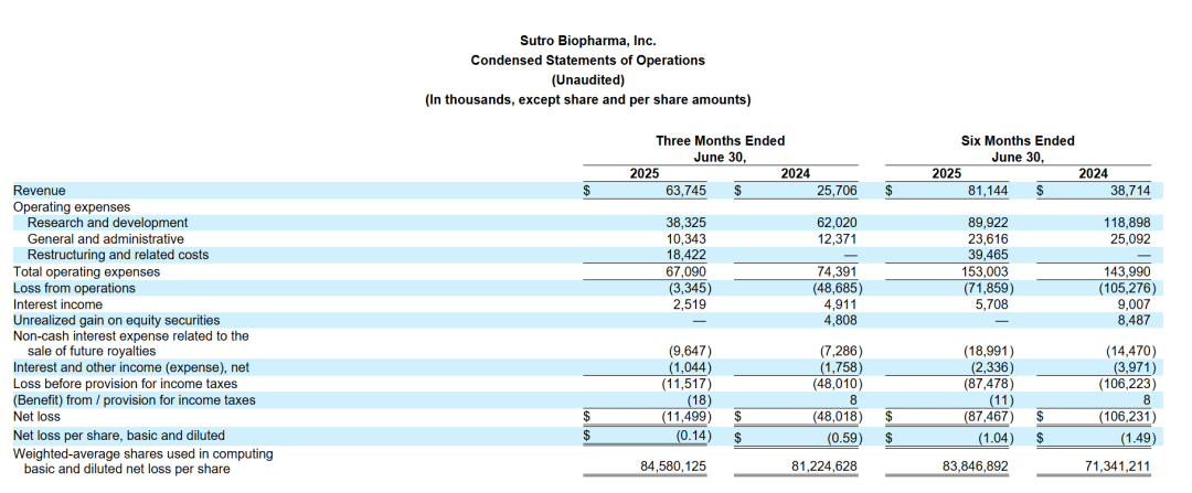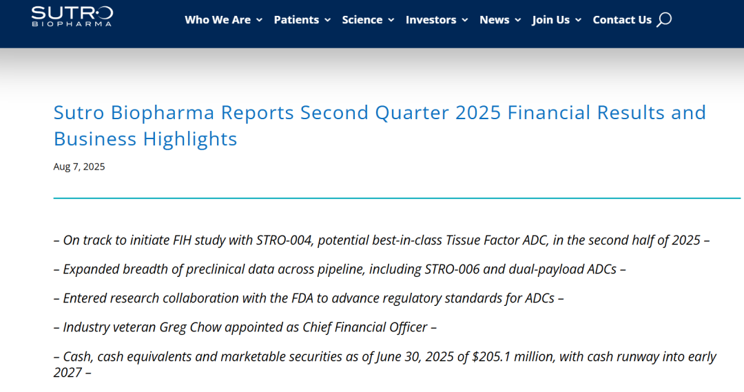 彼时的Sutro还在经历断臂求生的阵痛,而近日,Sutro Biopharma公布了其2025 Q2的财务业绩和业务亮点,展示了其ADC产品管线的重大进展,似乎前景明朗了起来。