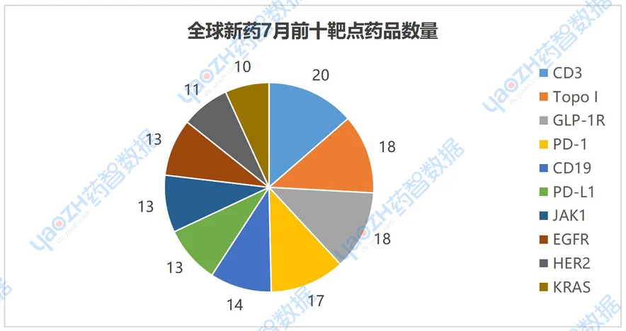 7月有更新动态的766个项目中,涉及最多的靶点是CD3,其次是Topo I和GLP-1R。以下是排名前十的靶点,图中仅展示药品数量,具体内容可通过全球药物分析系统进行查看。