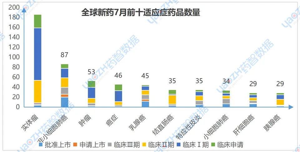 7月有更新动态的766个项目中,涉及最多的适应症是实体瘤,其次是非小细胞肺癌和癌症。以下是排名前十的适应症及其全球最高研发阶段情况,图中仅展示药品数量,具体内容可通过全球药物分析系统进行查看。