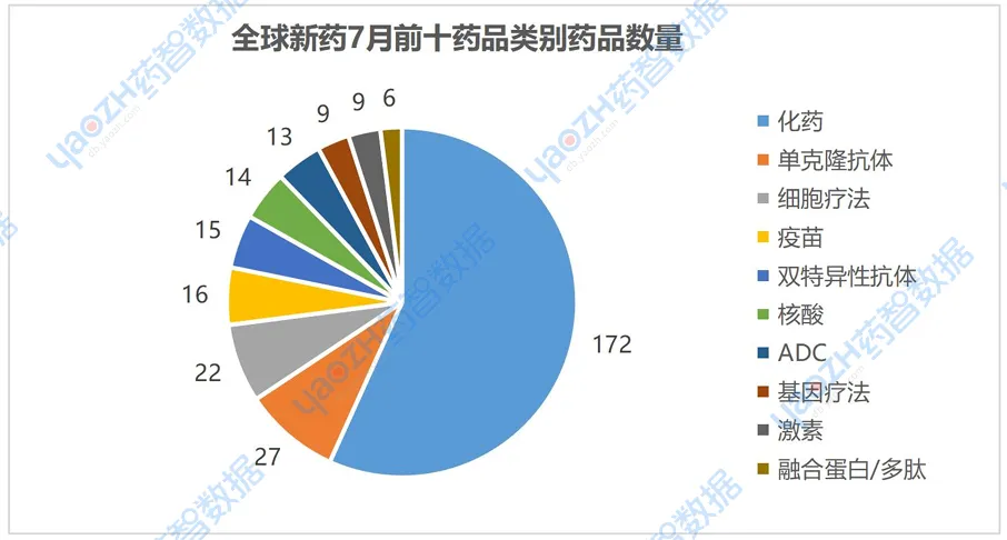 7月有最新进展的312个药品中,药品类别占比前三的分别化药57%,单克隆抗体9%,细胞疗法7%。图中仅展示前十药品数量,具体内容通过全球药物分析系统进行查看。