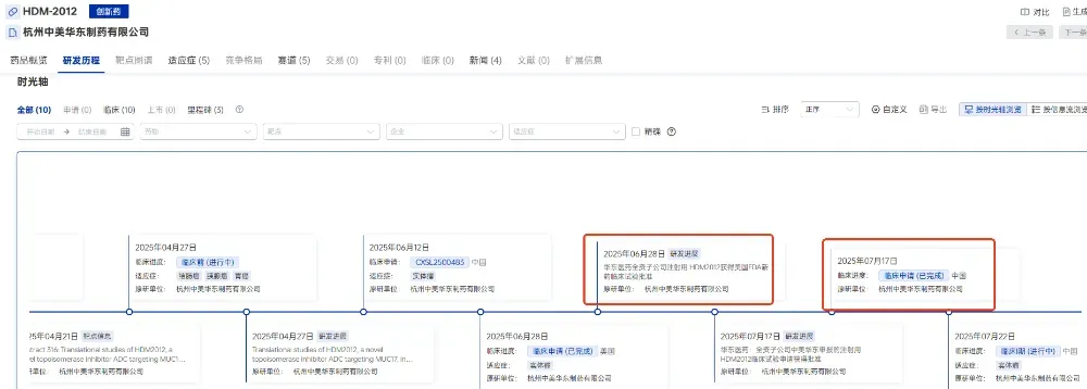2025年7月17日,根据CDE官网显示,中美华东自主研发的HDM-2012注射液获批临床,这是全球首款靶向粘蛋白-17(MUC17)的抗体偶联药物(ADC),由抗MUC-17的单克隆抗体与拓扑异构酶 I 抑制剂通过可裂解连接子偶联而成。中美华东在2025年5月向FDA递交HDM-2012的临床申请,并于6月底获批,在3个月内实现了中美两地IND“双报双批”。