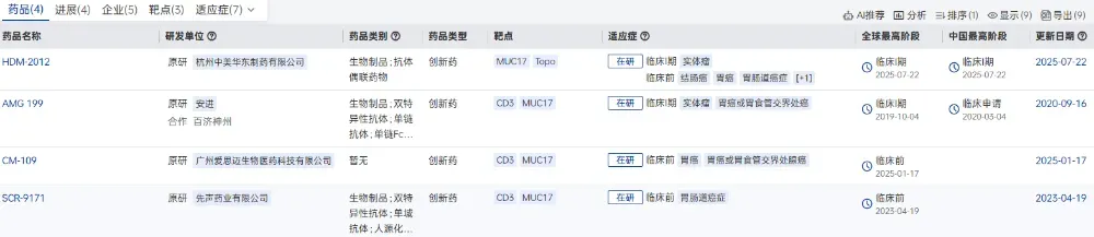 MUC17靶向药物在研格局(图片来源:药智网数据企业版-全球药物分析系统)