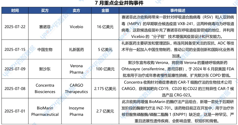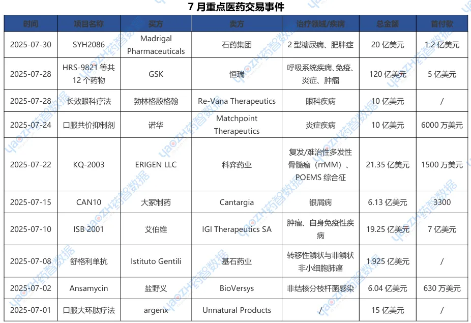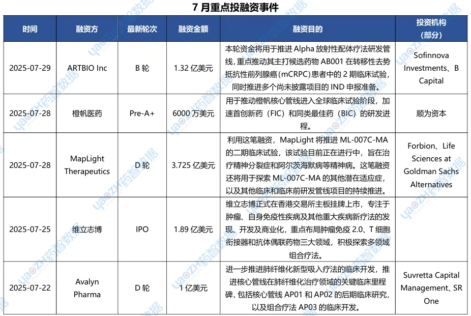 据市场投资格局统计,2025年7月共281条医药交易事件、160条医药投融资事件和31项企业并购事件发生,重点交易信息如下,完整清单详见市场投资格局数据库。