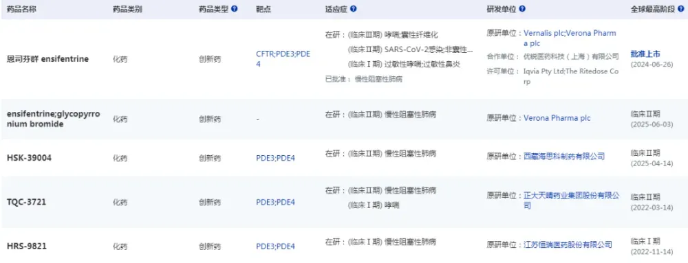 国内PDE3/4部分研发赛道(数据来源:药智数据企业版-全球药物分析系统)