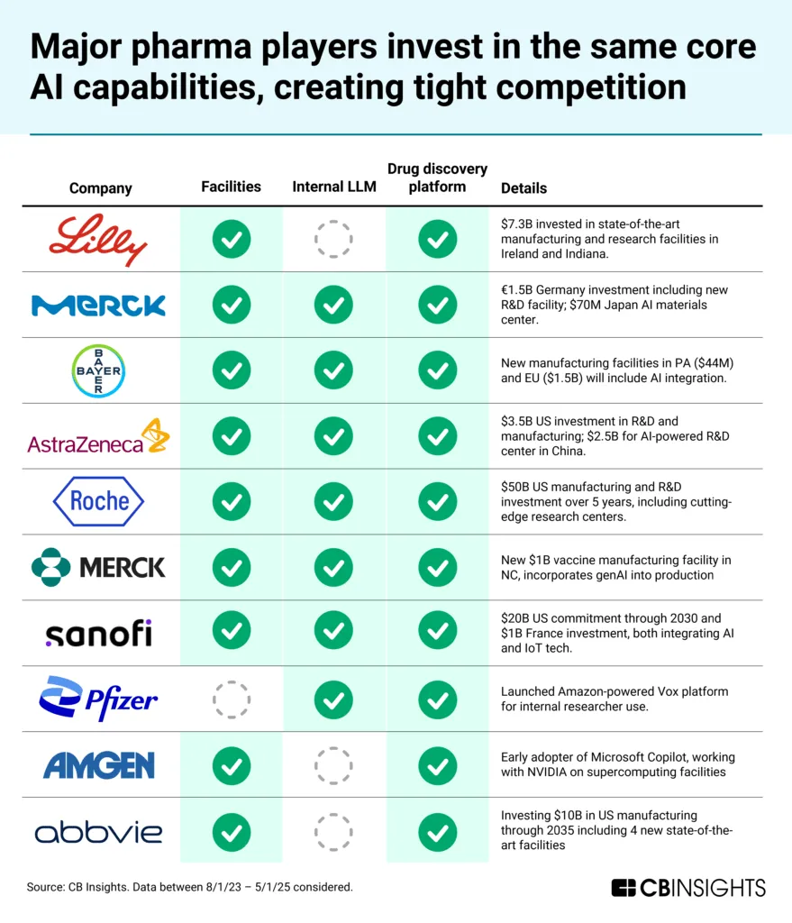以美国礼来制药为例,其在AI领域的投资额从2022年的7亿美元猛增至2024年的15亿美元,仅仅是在去年一年就新增13项AI相关投资,几乎将业内有潜力的AI项目“一网打尽”。默沙东也不甘落后,通过10笔AI投资紧随其后。