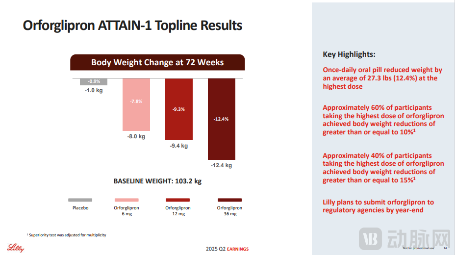 图1. 口服减重药Orforglipron的临床实验结果(礼来公司披露)