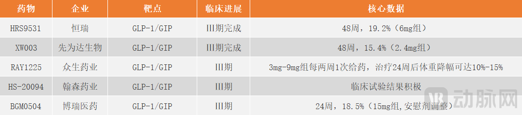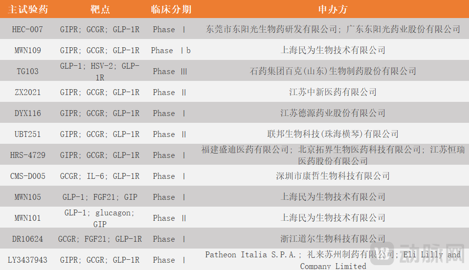 图5. 目前国内市场在研的三靶点减重药物(动脉网制图)
