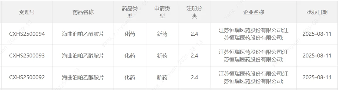 8月12日,恒瑞医药宣布其自主研发的1类新药海曲泊帕乙醇胺片的药品上市许可申请获中国国家药监局(NMPA)受理,适应症为:适用于既往对糖皮质激素、免疫球蛋白等治疗反应不佳的原发免疫性血小板减少症(ITP)成人及≥6岁的儿童患者。