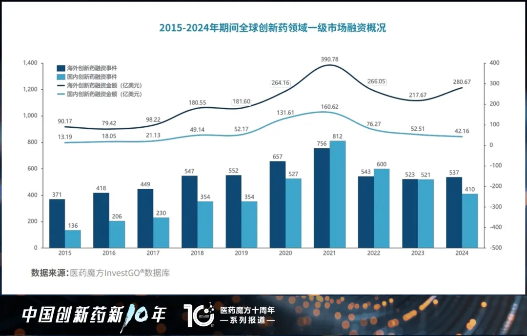 回头看长线的融资数据,海外的创新药一二级市场融资的下跌趋势在2023年已经明显放缓,2024年似有回暖之意。