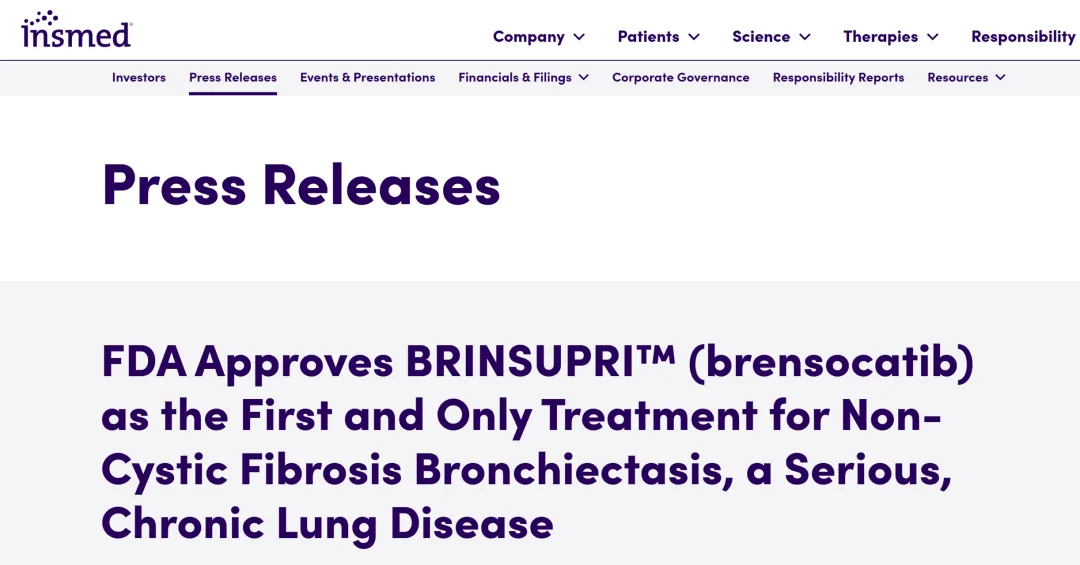 2025年8月12日,Insmed宣布,FDA正式批准其DPP1抑制剂brensocatib上市,用于治疗12岁及以上儿童和成人非囊性纤维化支气管扩张症患者。