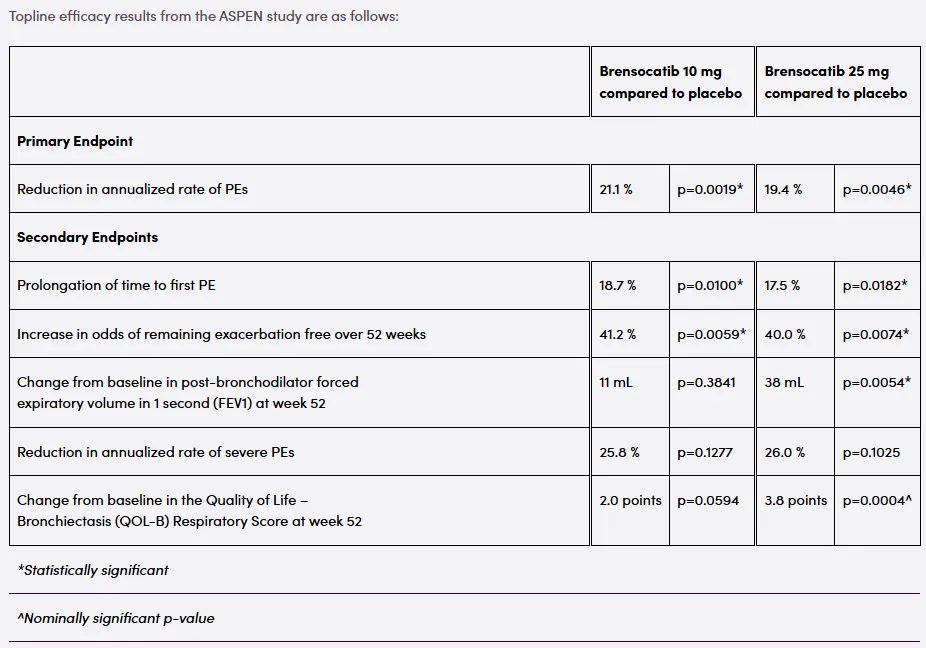 2025年2月,FDA正式受理Brensocatib用于治疗非囊性纤维化支气管扩张症的新药申请(NDA),并授予优先审评资格。该上市申请是基于Insmed ASPEN III期临床试验的积极结果。ASPEN III期是一项多中心、随机、双盲、安慰剂对照的临床研究,评估Brensocatib在非囊性纤维化支气管扩张症患者中的疗效和安全性。该试验纳入超过1680名患者,随访时间为48周,是迄今为止规模最大的相关研究。试验完整结果已发表于《新英格兰医学杂志》(NEJM)。