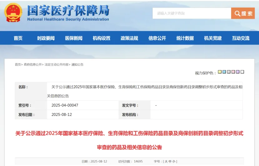 形式审查是对申报药品是否符合当年基本医保目录和商保创新药目录调整申报条件以及药品信息完整性进行的审核,分为初审、初审结果公示、复审、复审结果公告四个步骤。本次公示的内容即为2025年的初审结果,仅代表该药品具备了参与目录调整后续工作流程的资格。