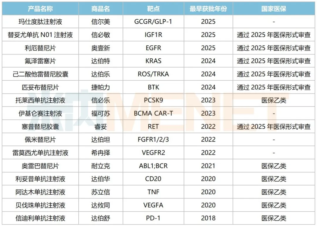 在非肿瘤领域,信达生物的信必乐(托莱西单抗)最早于2023年11月获批,为国内首个本土原研的PCSK9抑制剂,2024年12月纳入国家医保目录,2025年一季度在中国三大终端六大市场的销售额增速超过900%;信尔美(玛仕度肽)于2025年6月获批,为全球首个GLP-1R/GCGR双靶点激动剂,分析师预测其销售峰值有望突破80亿元。