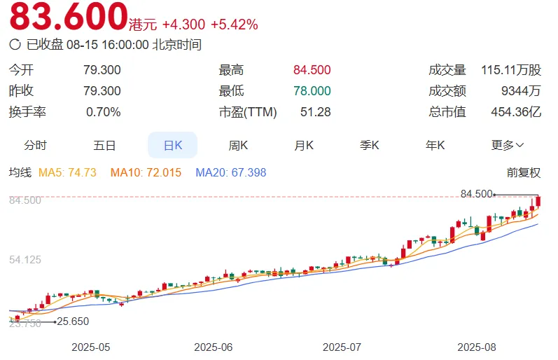 今年以来,复宏汉霖股价连创新高。截至 8 月 15 日收盘时,复宏汉霖港股报价 83.6 港元/股,总市值已达到 454.36 亿港元。与年初最低点相比(15.2 港元/股),股价暴涨 450%,同时也刷新了其港股上市以来的最高记录。而在今年 5 月,复宏汉霖还被成功纳入 MSCI 全球小型股指数成分股。