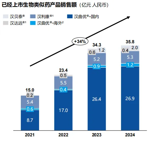 汉曲优是中国首个自主研发的曲妥珠单抗生物类似药,已在全球 50 多个国家和地区获批上市,成为了首个同时在中欧美获批的「中国籍」单抗生物类似药;
