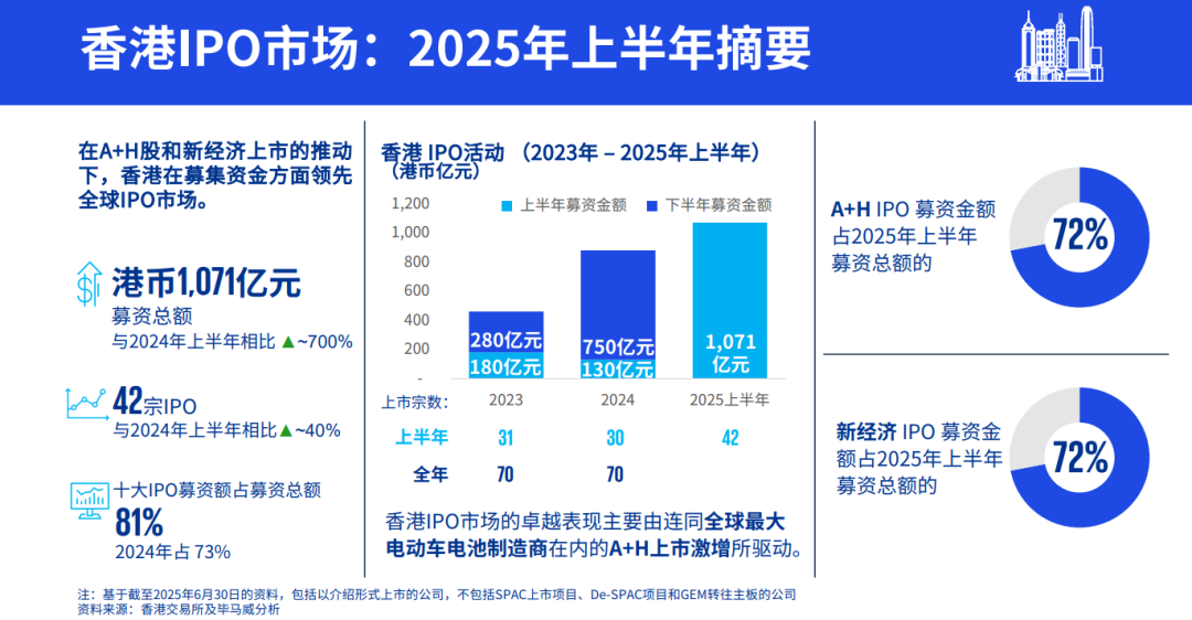 据毕马威(KPMG)发布的《2025 年中国内地与香港 IPO 市场:2025 年中期回顾》报告,港股上半年新股集资募资1071亿元,在全球 IPO 排名中稳居第一,集资规模同比几乎翻七倍!